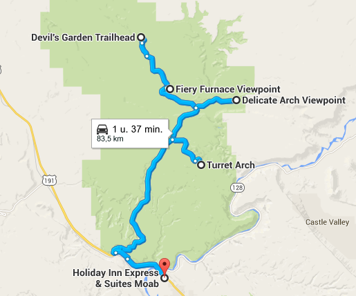 Lunchen doen we in Moab zelf omdat we op voorhand al hadden beslist om een pauze te nemen in het hotel. We lunchen bij Denny’s en gaan dan even afkoelen in het hotel. Tegen 17.30 vertrekken we terug naar het park.