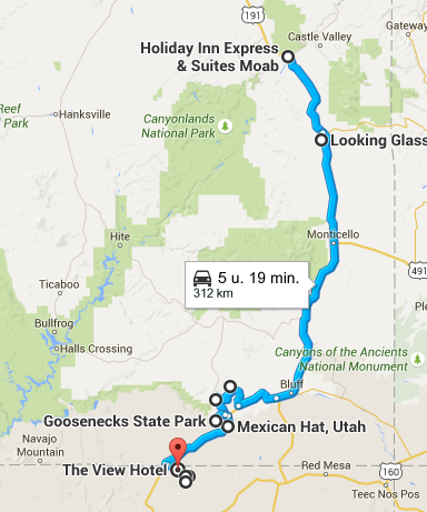 Ook hier is er maar 1 viewpoint dus we zijn hier ook snel klaar. We rijden Mexican Hat door en stoppen bij een lokaal café en restaurant. We houden onze broodjes voor morgen en eten hier maar even warm. In het hotel kunnen we toch pas inchecken vanaf 16u.