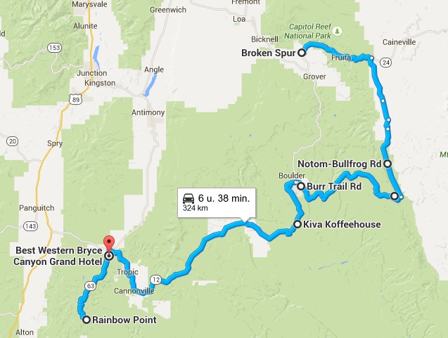 Verder rijden dan maar. We passeren Boulder en iets verder stoppen we bij Kiva’s Coffee House voor een 12-o-clock koffie. Americano en Chai Latte please. Daarna terug de auto in en we zien dat TomTom op de iPhone zegt dat we al tegen 13u30 bij het hotel in Bryce Canyon zullen toekomen.