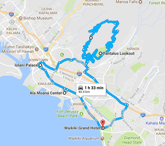 Vanuit daar vertrekken we richting de Tantalus lookout. Het warmteverschil is duidelijk tov maand maart: wat is het warm en weinig wind! Na de Tantalus lookout en rondrit maken we een korte stop bij het Iolani Palace. Een fotootje later vertrekken we richting het shopping mekka van Honolulu en omstreken: Ala Moana.