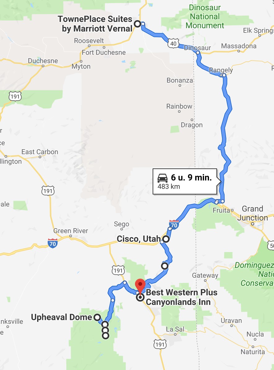 Na een telefoontje met het hotel kunnen we al vroeger inchecken, wat we ook doen kort na 14u. Na korte opfrissing beslissen we om toch een bezoekje te brengen aan Canyonlands NP. We hoeven onze pas niet te tonen aan de booth. Na een korte stop bij het visitor center rijden we naar de Upheaval Dome. Daar hiken we tot de eerste overlook.