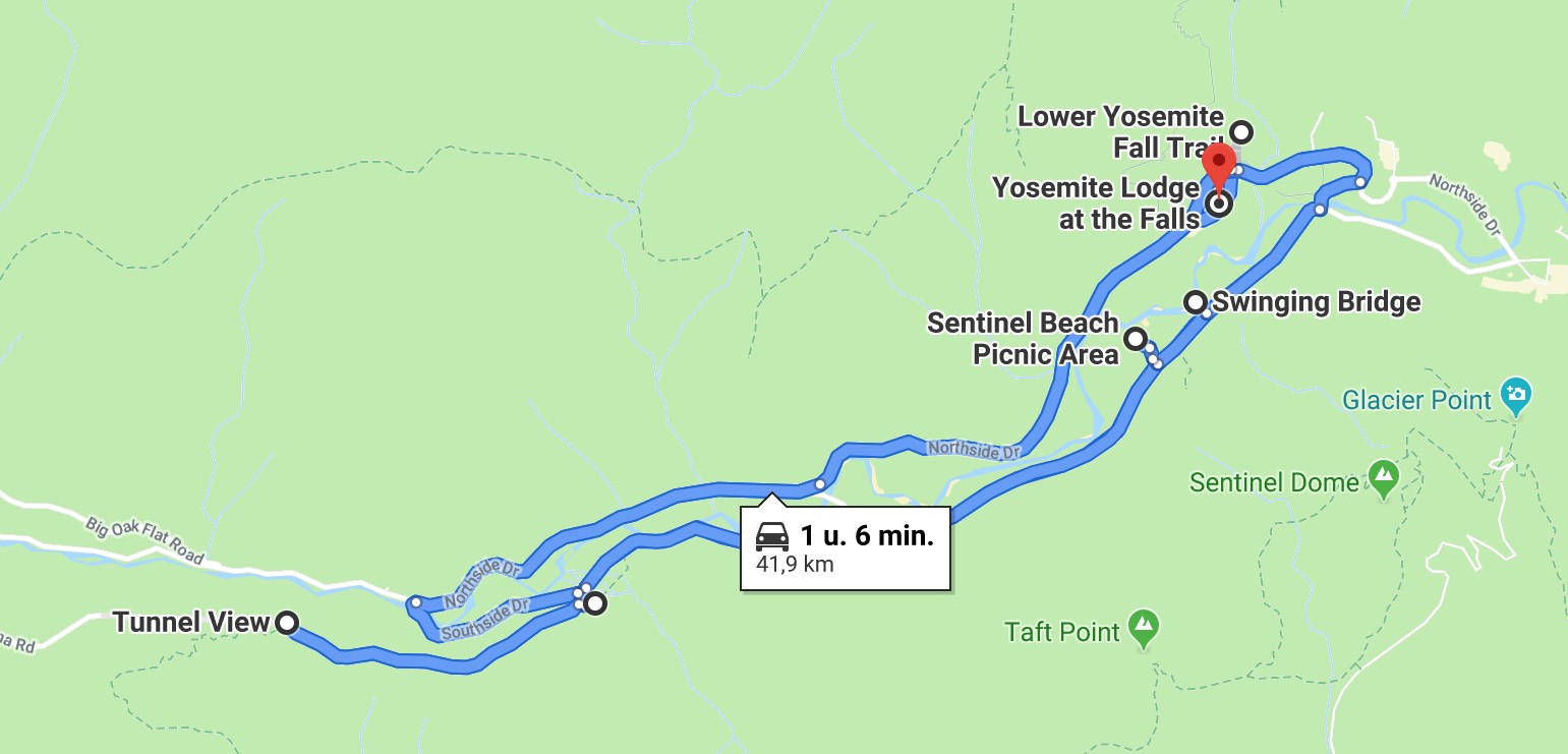 Het is ondertussen al middag en we lunchen op de kamer, om daarna de wagen te nemen richting onze korte hike van de dag: Bridalveil Falls. Na een kwartiertje wandelen komen we al dicht bij de waterval ( en krijg je ook al meteen de nevel over je heen). Na deze waterval rijden we nog eventjes verder naar de Tunnel View viewpoint, iets waar we gisteren niet waren voor gestopt. Na de Tunnel View keren we terug en stoppen we nog eens bij Sentinel Beach en de Swinging Bridge.